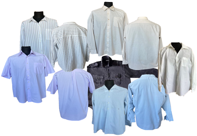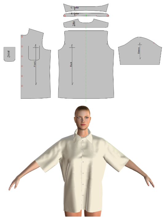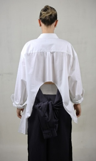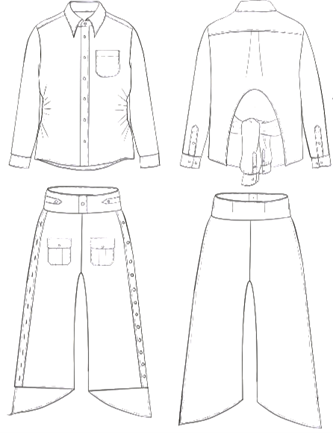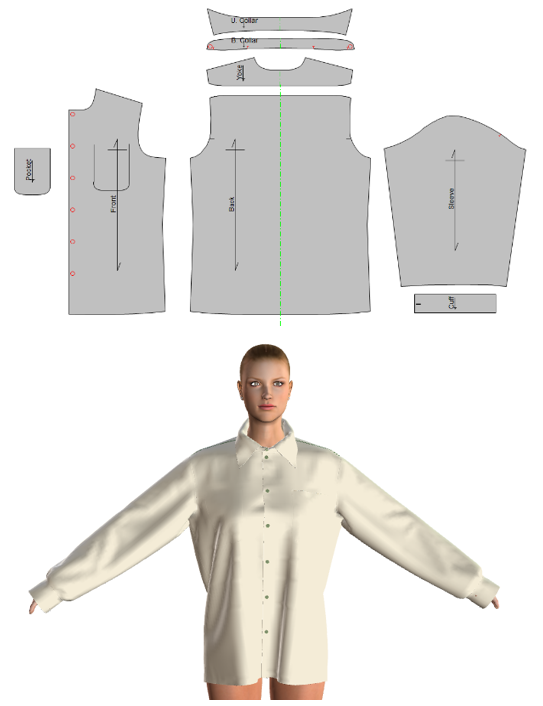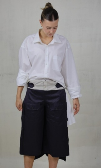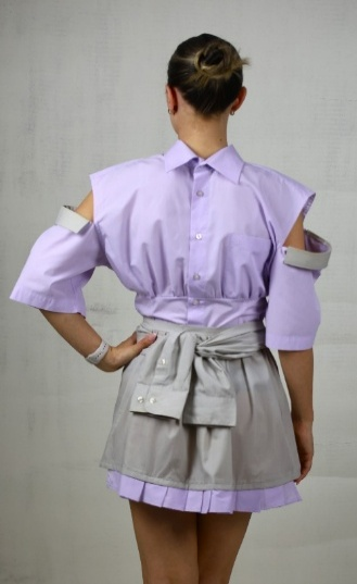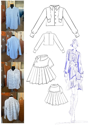 The virtual 3D prototypes of the shirts basic pattern designs served as a starting point for the redesign approach, which aimed to utilise as much of the existing discarded shirts as possible, following the principle of zero-waste. To this end, virtual prototyping cycles were carried out to achieve the desired aesthetic appearance of the garment, considering the minimal amount of textile material left over from the individual shirt. Once each virtual 3D garment prototype was approved, the physical prototypes of the garments were also created following the same principle of shirts cutting and assembling the shirts pattern pieces.
