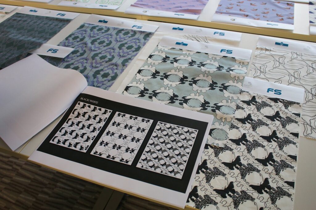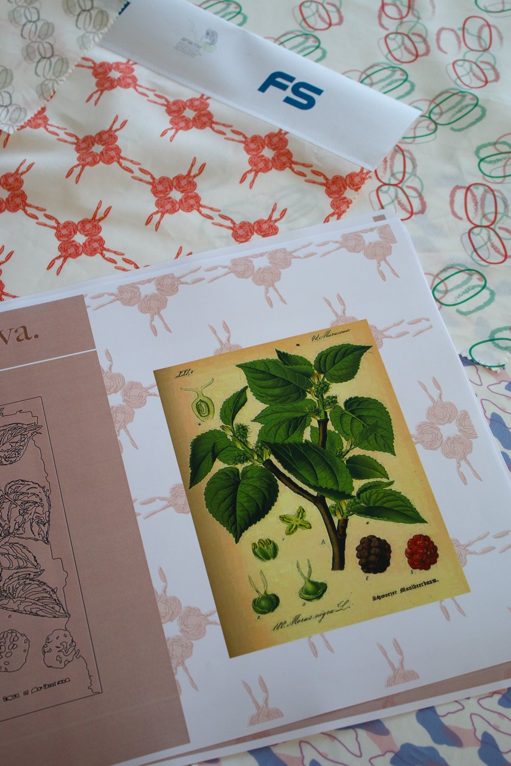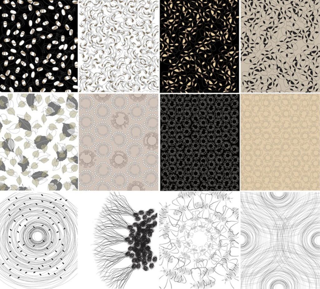 The textile patterns for textiles on the theme of the Silk Road were designed by students on the Digital Design and Printing and Textile Design programmes at FSUM. Their designs are inspired by the life cycle of silkworms, cocoons, mulberry leaves and fruits. Visual aids were also developed as part of the project to illustrate the stages of mulberry cultivation and silk production. The resulting patterns range from precise geometric repetitions in neutral tones to expressive organic compositions in vibrant colours and textures.